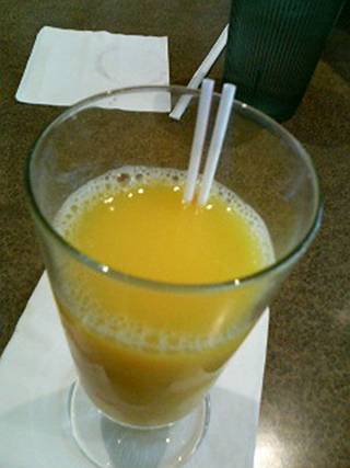 しかし露見されたところで腹は減るので、適当に店に入って飯を注文します―――といっても、DNDD自身はまったく空腹でなく、他の身内ががっつくのを横目にしてただけですが。なんでこんなに食えるんですかあんたら? しょうがないのでジュースでも飲むか。英語:おーい姉ちゃん、オレンジジュースひとつ!