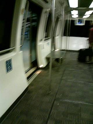 ほぼ立ち席で、ポールはありますがつり革はありません。長くても3分くらいしか乗らない列車ですから、それで充分なのでしょう。バリアフリーでして、車椅子の乗り降りもラクラク……とまではいきませんが、日本ほど敷居が高くないと思います。