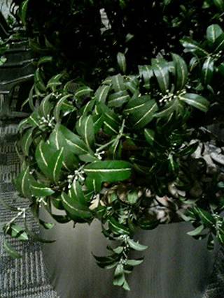 なにやら、正面から見ると花が開いたように、三つ葉がとびでている木です。偽物かもしれません。