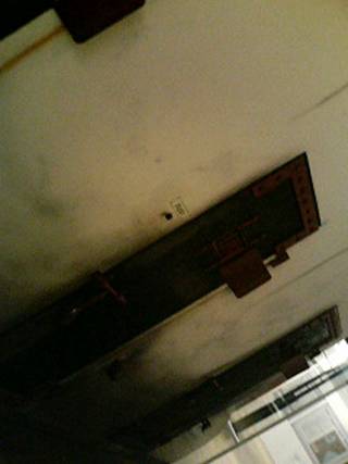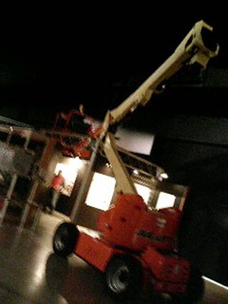 人が、先端にくっつけたかごに載って、天井の修理してました。