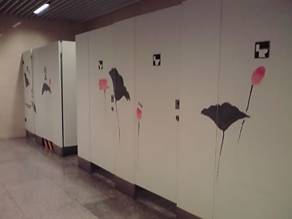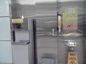 ↓ところどころに飲み水コーナーがあります。下向き三角にとんがってるのは紙コップです。つっても、コップとは名ばかりのペラい紙なので、熱湯を注いだらヤケドしかけますけどね(左のメカから熱湯も出ます。ティーバック入れたタンブラーに入れてる方もいました)。