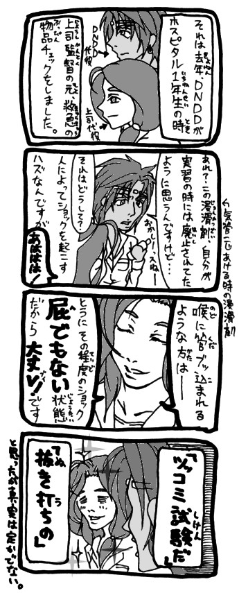 その日別の用向きで院外に出ていたDNDDが帰ってくる前には、ほとんどのチェックが班員その3ほか1名によって成されていたわけで。DNDDなんて、班員その3がメモした薬品リストをコピーしてもらって目を通すくらいです。
